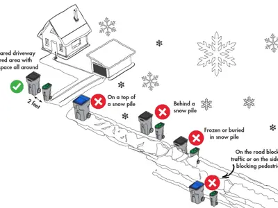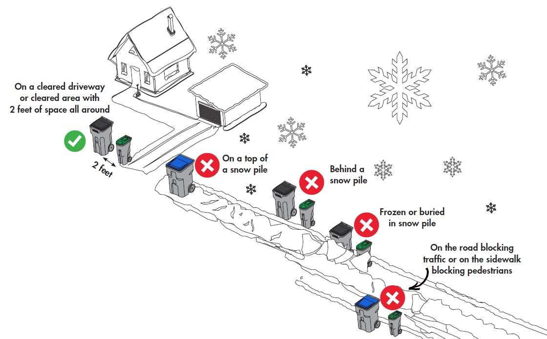 - place carts within eight feet of the traveled section of the road (this allows the automated arm to reach the carts and snow clearing equipment can still pass by)